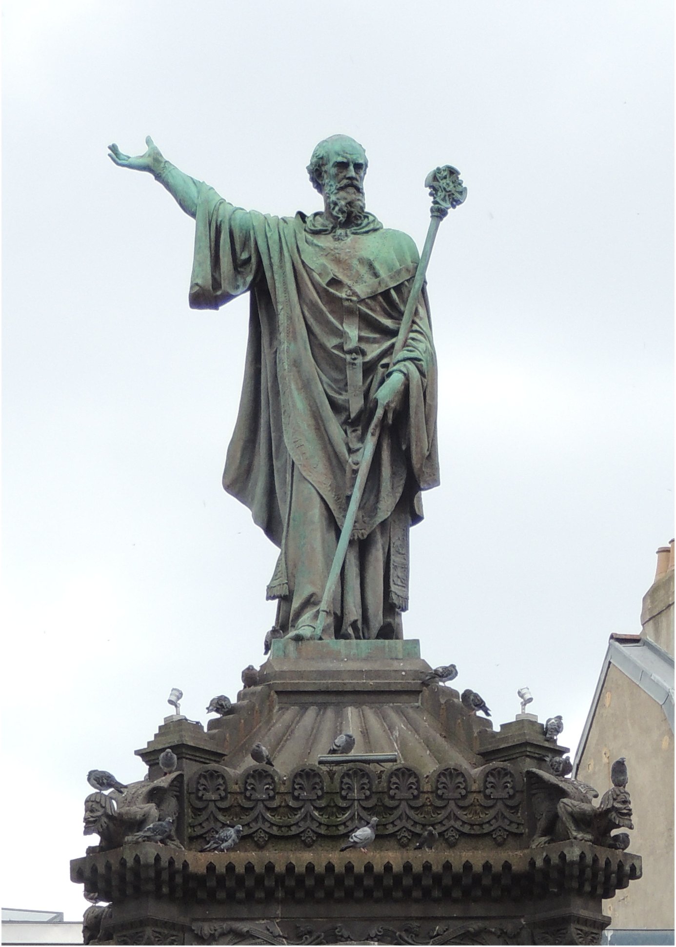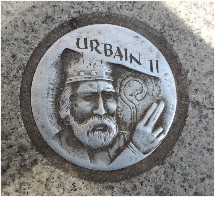 Le guide commence sa visite devant la statue de URBAIN II, représentant le pape , qui a prononcé le 27 novembre 1095, un appel à la croisade, lors du Concile de Clermont. Il fait face à la cathédrale et désigne de la main droite la direction de la Terre Sainte .