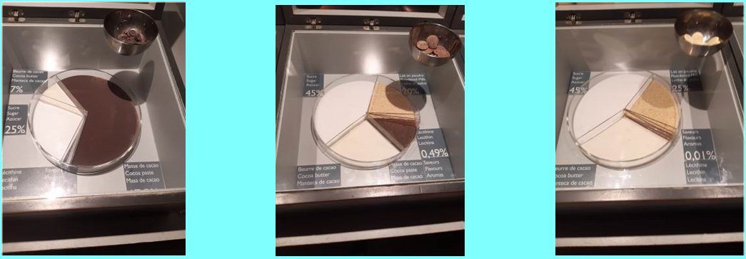 Le chocolat noir, le chocolat au lait et le chocolat blanc sont présentés avec le pourcentage de chaque ingrédient.