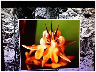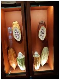 Une représentation du cacaoyer (théobroma) issu du bassin amazonien, avec les cabosses accrochées au tronc, nous instruit sur le cycle de production de la fleur au fruit : l’arbre peut produire jusqu’à 100 000 fleurs mais, une fleur sur 500 va donner une cabosse.