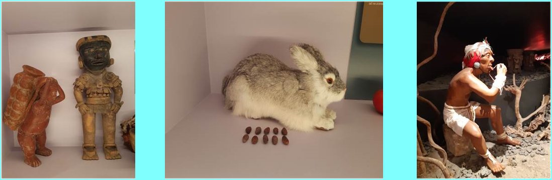 Arrêt devant la vitrine des Pochteca, voyageurs de commerce et porteurs de fèves dans toute la région des tribus Aztèques et Mayas ; les fèves étaient utilisées comme monnaie d’échange (exemple avec le lapin).