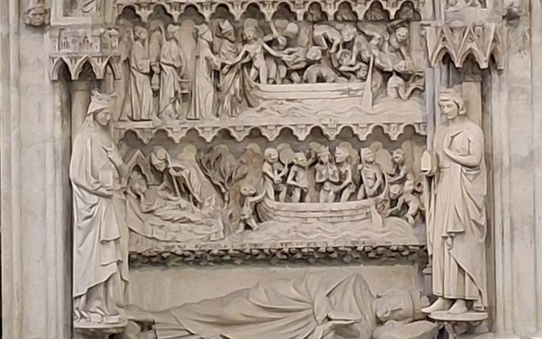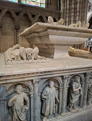 L’étude de ce tombeau révèle une histoire peu banale : en bas, le roi est sur une barque en route vers les portes de l’enfer (à cause de sa mauvaise politique contre Saint Denis, St Maurice et St Martin) et au-dessus en revanche, direction vers le Paradis pour son retour en grâce envers Saint Denis.