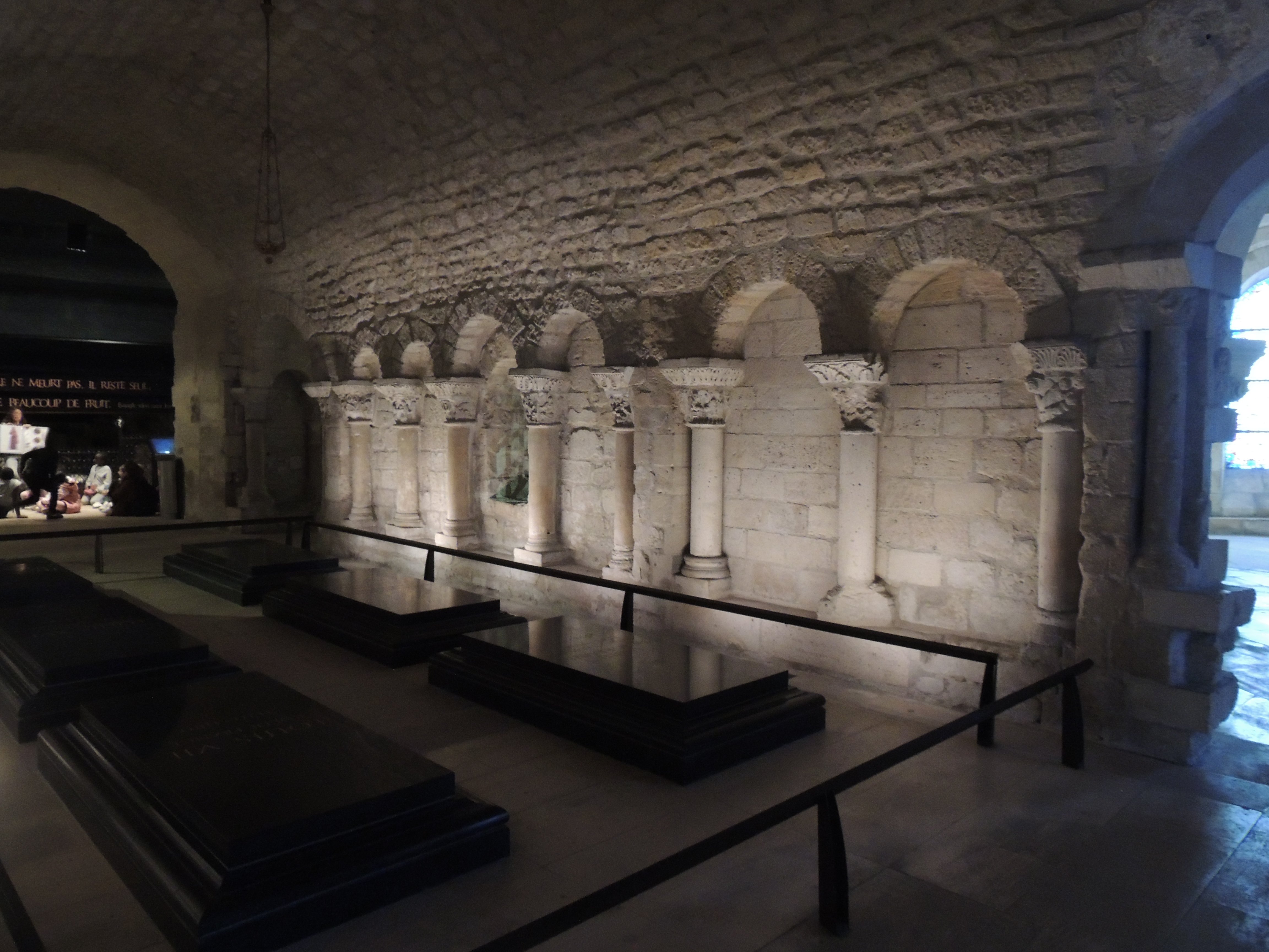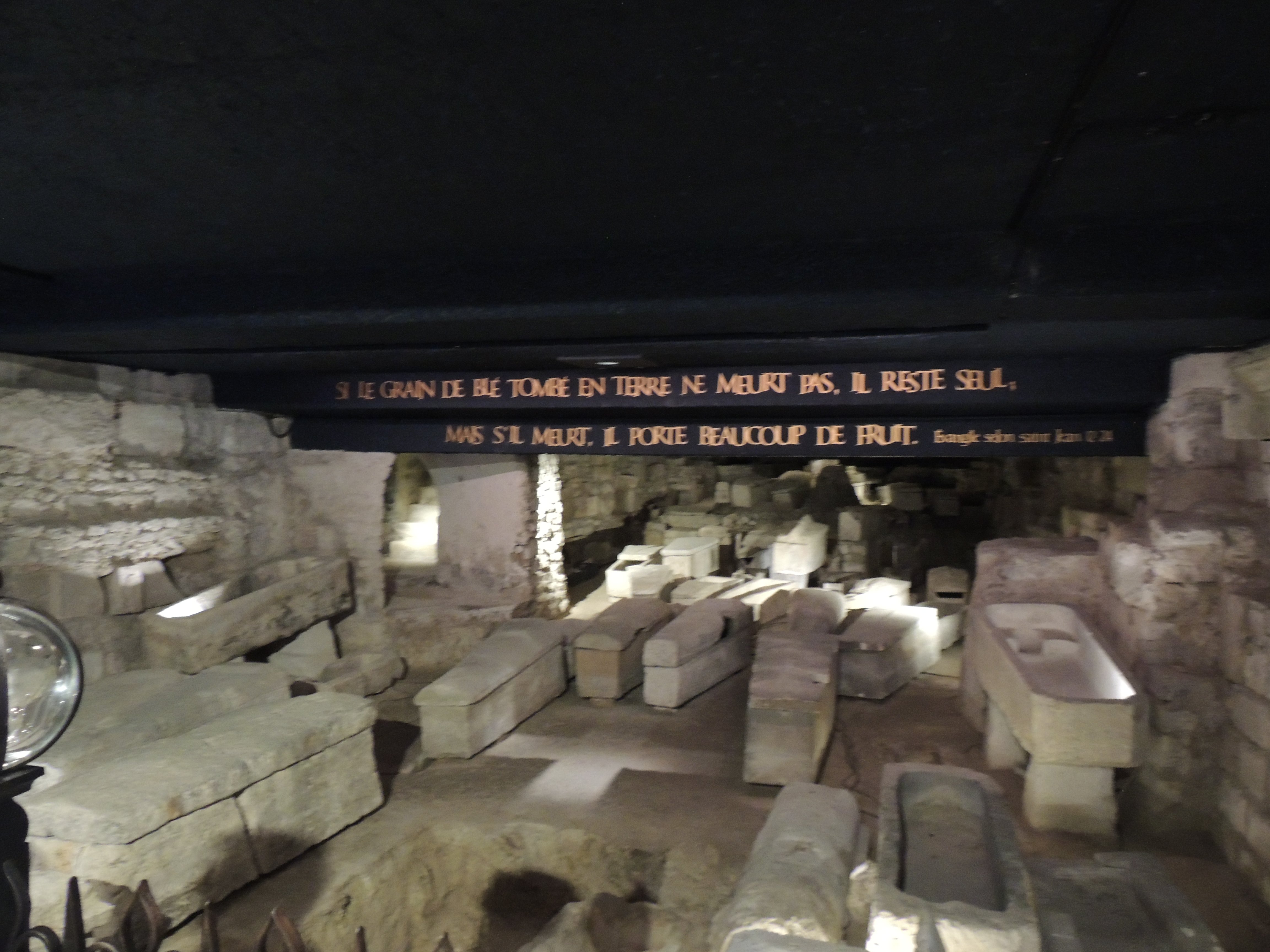 Nous plongeons dans les entrailles de ce lieu chargé d’histoire en pénétrant dans la crypte dans laquelle les archéologues ont mis au jour des sarcophages, époque mérovingienne et carolingienne.