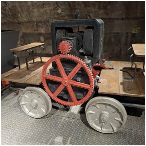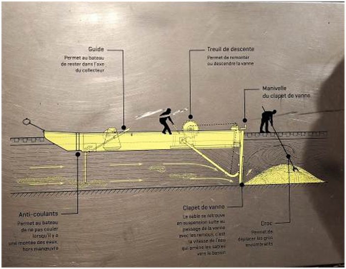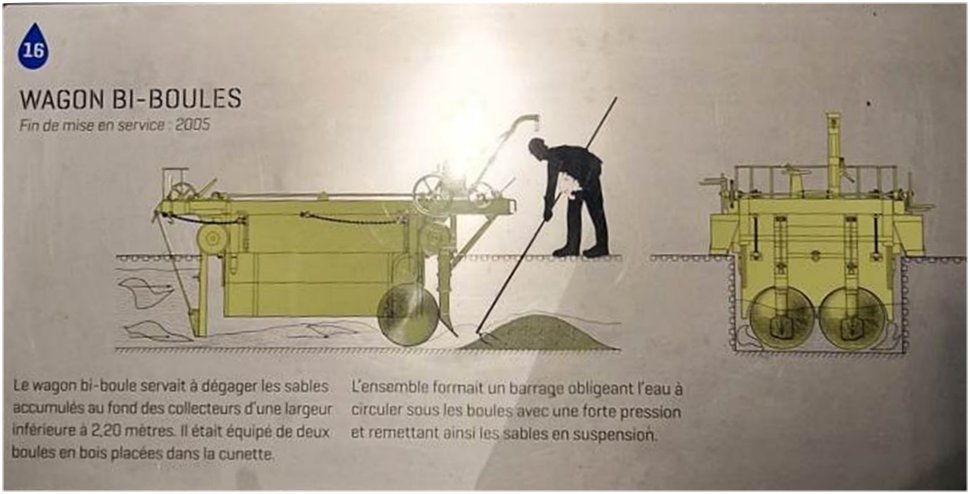 Nous observons différents équipements, locomotive et wagonet, barque de ramassage … témoins d’un travail en milieu difficile.